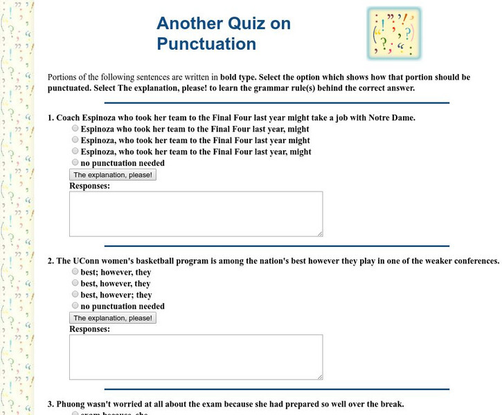 This punctuation quiz requires the student to insert necessary commas before comparing his or her version to the possible answers.