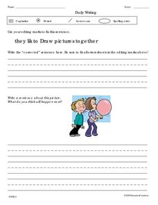 In this writing worksheet, learners practice proofreading skills by using editing marks to fix one sentence, then rewriting it correctly. Students also examine a humorous picture and write what they think will happen next.