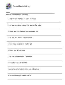 In this language arts worksheet, students correct the errors in capitalization, punctuation and grammar in 10 sentences. Students rewrite each sentence correctly.