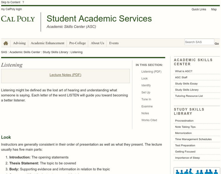 This site from the California Polytechnic State University provides a concise and well done guide to listening that coveys what the instructor has to say, as well as the tasks of the listener. Good advice, easy to download as a one page...