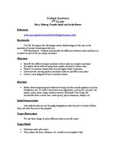 Fifth graders examine and identify different simple machines that make up complex machines. They analyze and discuss different gadgets and appliances brought in from home, then in small groups examine one of the machines in detail. ...