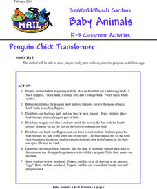 Learners study baby penguins and whales. They name the penguin body parts and examine how penguins hatch from eggs. They name whale body parts and their function. They participate in a whale role play activity.