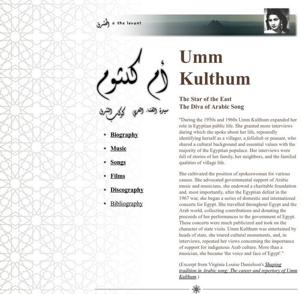 This site introduces Egyptian songstress Umm Kulthum. This page presents a brief overview of her career, with links to a detailed biography, music and movie lists and clips and articles about her music.