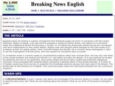 In this London Bombing worksheet, students read the article, answer true and false questions, complete synonym matching, complete phrase matching, complete a gap fill, answer short answer questions, answer discussion questions, write,...