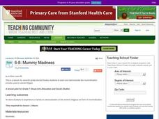 Students create a mummy using the mummification process. In this mummy lesson, students peel an apple and place the peeling in a baby food jar. They carve a face into their apple, dry it in salt and wrap it in toilet paper to bury.