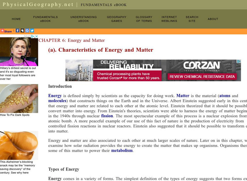 A lengthy page from the Fundamentals of Physical Geography site. Energy is distinguished from matter, and the different forms of energy are identified and discussed. Four types of heat transfer (convection, advection, conduction,...