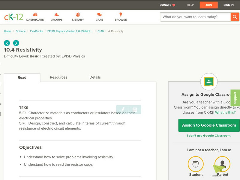[Free Registration/Login may be required to access all resource tools.] The factors that affect resistivity are explained, e.g., wire gauge and length, and conductivity. Also touches upon semiconductors and superconductors. The use of...