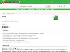 Students conduct an experiment. In this wind measurement lesson, students learn about instruments that measure the wind and then make a weather vane. Students record wind speed over a few days.