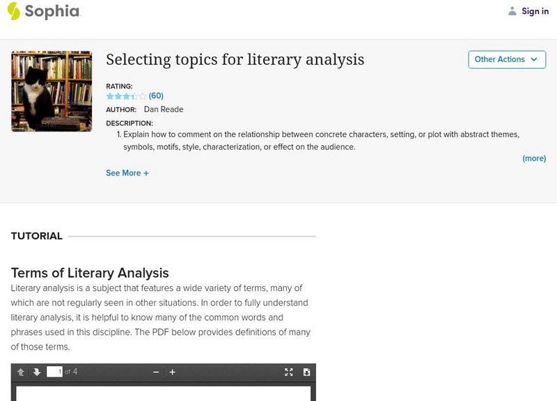In addition to thoroughly exploring the purposes and functions of an analytical essay, this resource provides students with step-by-step instructions for reading and analyzing poetry, prose-fiction, and fiction. The site also offers...
