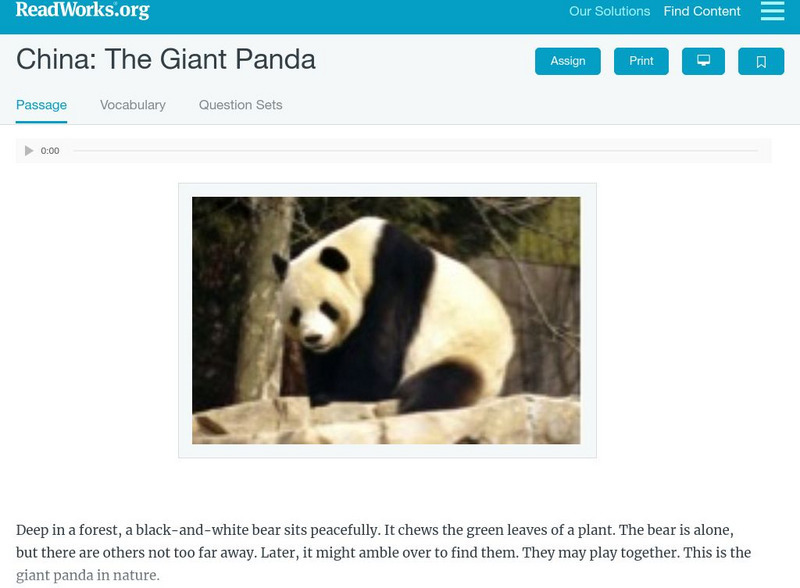 [Free Registration/Login Required] An informational text about Giant pandas that live in China. A question sheet is available to help students build skills in reading comprehension.