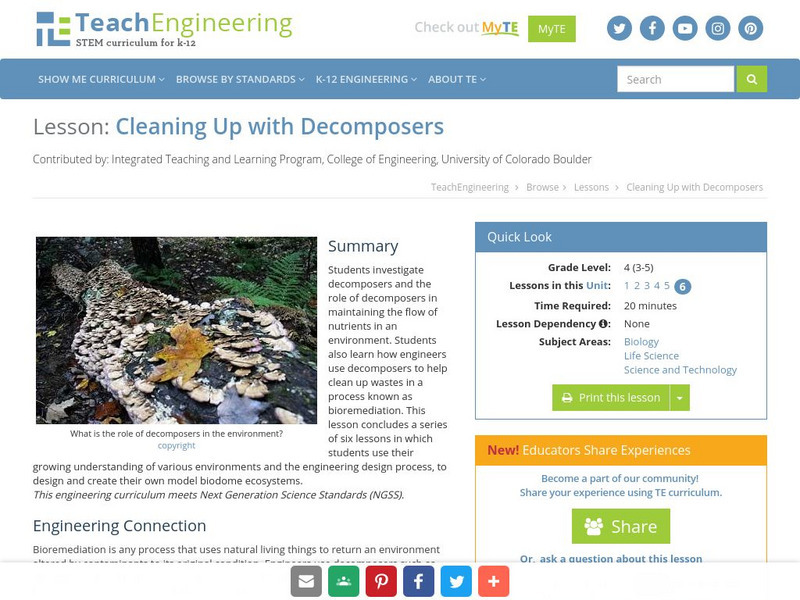 Students investigate decomposers and the role of decomposers in maintaining the flow of nutrients in an environment. Students also learn how engineers use decomposers to help clean up wastes in a process known as bioremediation. This...