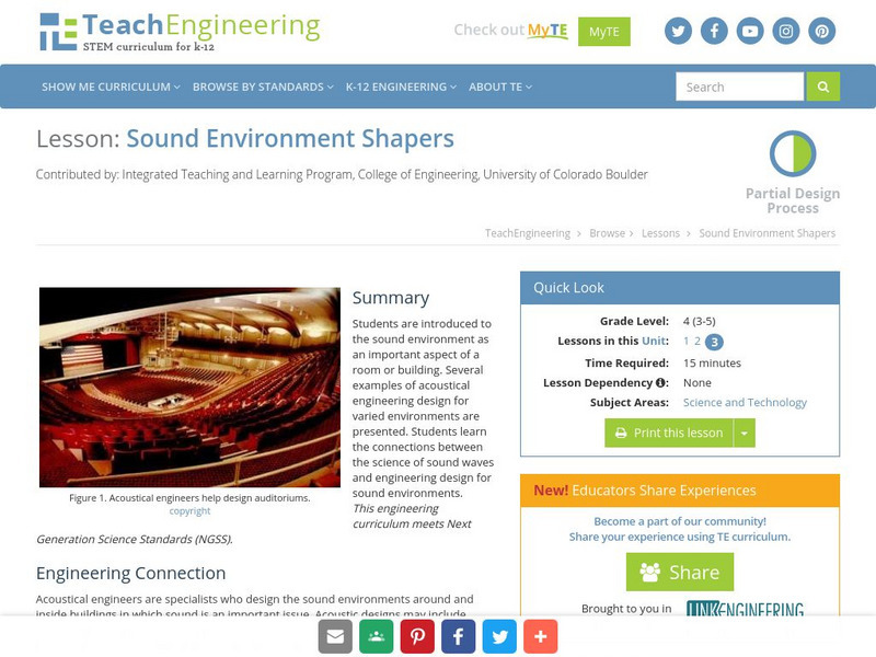 In this lesson plan, students are introduced to the sound environment as an important aspect of a room or building. Several examples of acoustical engineering design for varied environments are presented to students. Students learn the...