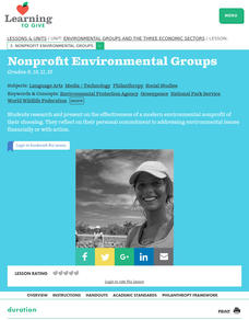 High schoolers examine the importance of nonprofit organizations when it comes to the environment. They discover how to evaluate different organizations. They research different organizations and present their findings to the class.