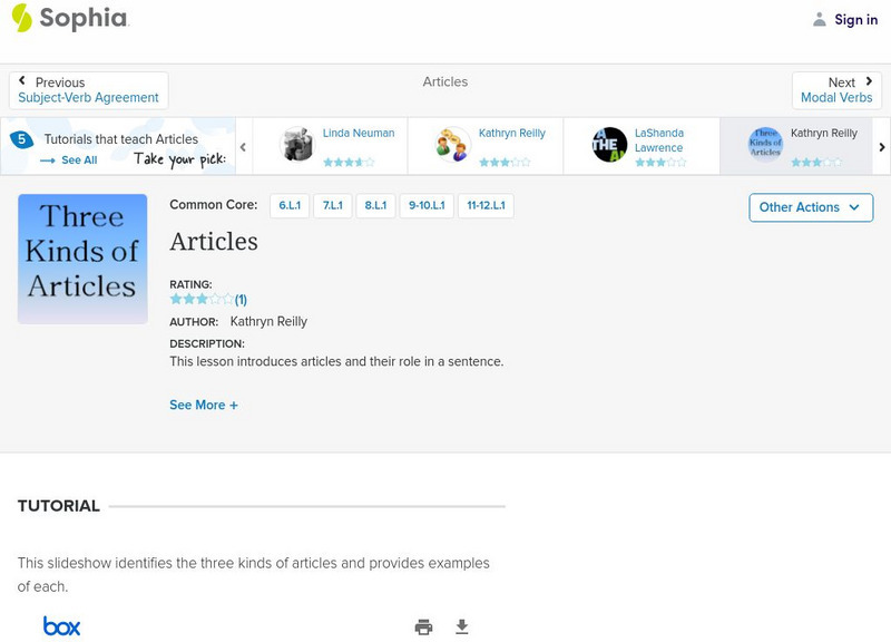 This tutorial focuses on the articles (a, an, the) including identifying them and the two types of articles: definite and indefinite. It offers 3 slide shows; the first one is non-audio and has students identify articles in sentences and...