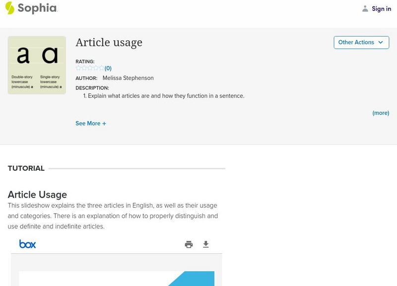 This lesson explains what articles are, how they function in a sentence, and how to determine correct article usage. It includes 4 videos about what articles are, how they function, definite, and indefinite articles and how to use them...