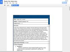 Students investigate parts of speech by analyzing action words in sentences. In this verb usage lesson, students read sentences to each other and identify the action words and verbs used. Students participate in a speed challenge in...