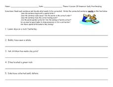 In this daily proofreading worksheet, learners correct the sentences on their grammar and punctuation. Students correct 5 sentences total.