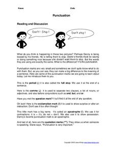 In this punctuation instructional activity, students connect 5 labels to the correct punctuation marks to what they show when used correctly in a sentence by drawing arrows to connect each one. Students fill in the missing punctuation...