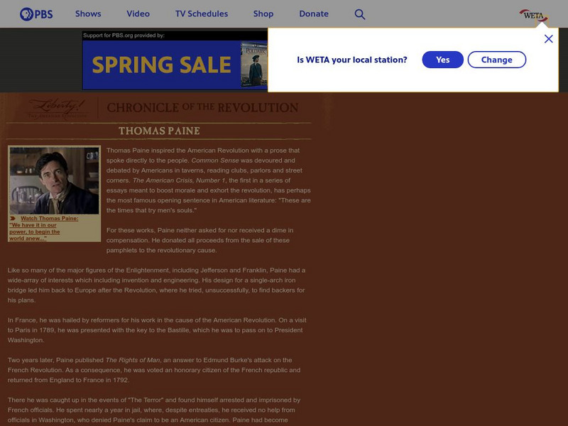 Short biography of Revolutionary activist Thomas Paine. Includes historical illustration of Paine plus a video clip from the PBS documentary "Liberty."