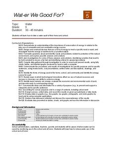Fifth graders investigate the use of water as a resource that needs to be conserved. They practice the skill of water conservation by taking a home survey of water usage and modify the use in order to decrease the wasting of water.