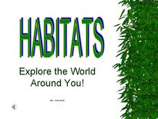 Explore the habitats found around the world. The Desert, Rain Forest, Tundra, Prairie, Grassland, Forest, Marine and Zoo habitats are all covered in this easy to follow presentation. Each slide has a themed background picture, several...