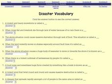 In this ESL vocabulary worksheet, students read a set of 10 descriptions related to disasters and determine what is being described. Students may click on an answer button for immediate feedback.