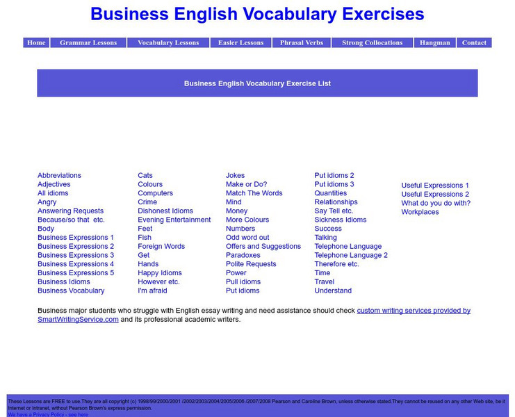 Choose from among a number of exercises designed for advanced English language learners. The menu of exercises, which appears on the right, covers a complete range of topics geared toward building vocabulary used in business-related...