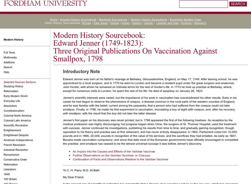 Fordham University: Modern History Sourcebook: Edward Jenner (1749 1823)