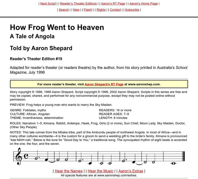 This reader's theater version of a folktale from Angola has been adapted by children's book author Aaron Shepard from his short story "How Frog Went to Heaven." For 16 players, ages 7-9, the story explores themes of inventiveness and...