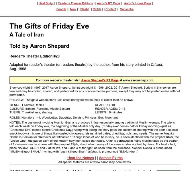 A reader's theater version of a folktale from Iran for ten players, ages 9-13. Adapted by children's book author Aaron Shepard from his short story "The Magic of Mushkil Gusha," the story explores themes of thankfulness and sharing....