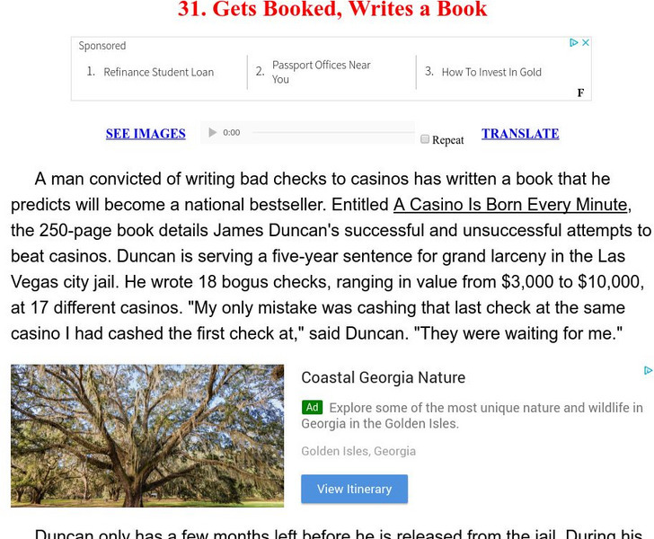 A learning module geared toward English as a Second Language Learners. Students read and/or listen to a short text entitled "Gets Booked, Writes a Book" and click on the links below to increase comprehension and vocabulary skills....