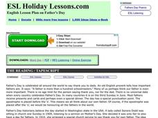 In this Father's Day worksheet, students complete activities such as reading a passage, phrase matching, fill in the blanks, correct words, multiple choice, spelling, sequencing, scrambled sentences, writing questions, survey, and...