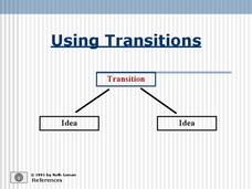 Transitions, words that reveal the relationship between two ideas, are the subject of a presentation that provides color-coded illustrations to show viewers how this part of speech functions in sentences. The PowerPoint concludes with an...