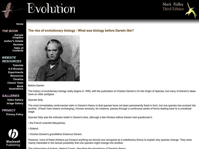 These pages are part of a site called "Evolution," that accompanies a textbook by the same name. Mark Ridley is the author. Here he discusses theories for species change that were before Darwin published "On the Origin of Species."