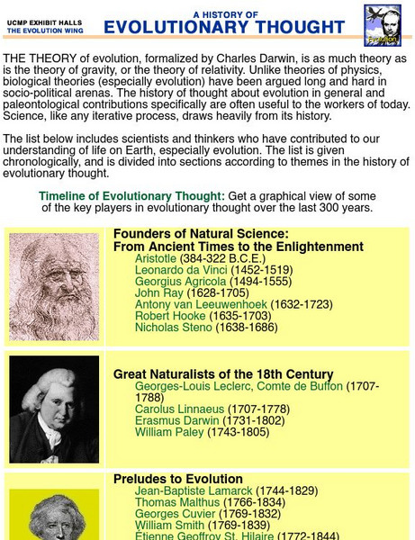 Museum site note on the history of evolutionary thought and includes scientists and thinkers who have contributed to our understanding of life on Earth. Links are provided for da Vinci, Linneaues, Erasmus Darwin, and others.