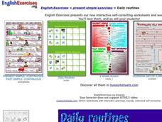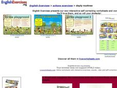 In this verbs worksheet, students complete a crossword, fill in the blanks to sentences, label the pictures, and more for daily routines. Students complete 4 activities total.