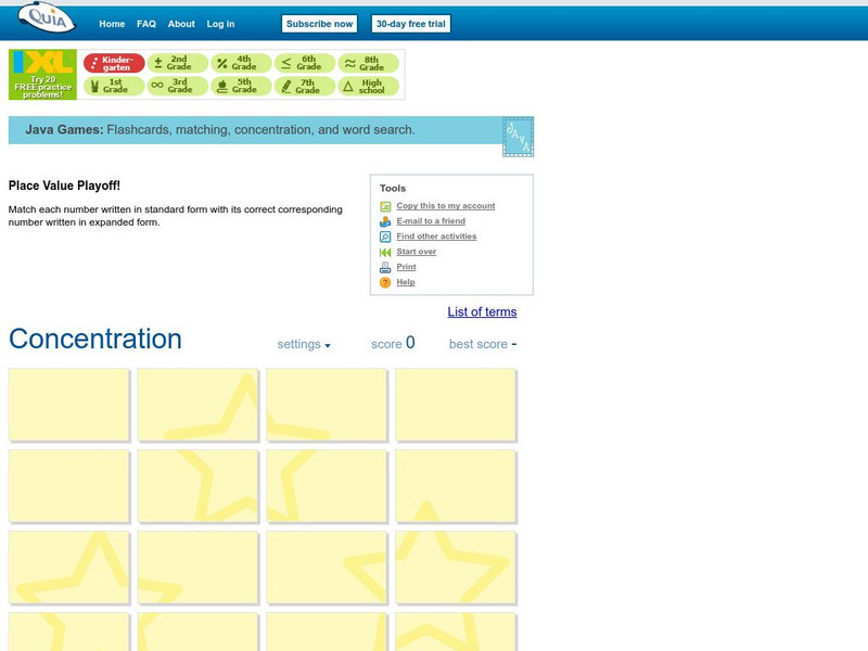 Do you need practice learning how to write the expanded form of numbers written in standard form? This concentration game is the web site for you! There is a link to a list of the numbers being used so you can check your answer.