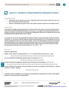 Develop an understanding of the properties of exponents through this series of activities. This third lesson of 15 explores the patterns associated with the power property. Scholars expand the powers before applying the property.