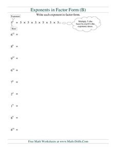For this exponents worksheet, students solve 12 problems in which exponents are written in factor form. Students show that the base number is multiplied by itself.