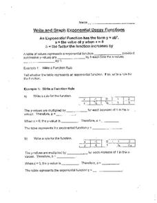 In this exponential functions worksheet, students solve and complete 13 various types of problems. First, they state whether the table represents an exponential function or not and why. Then, students graph each function and identify its...
