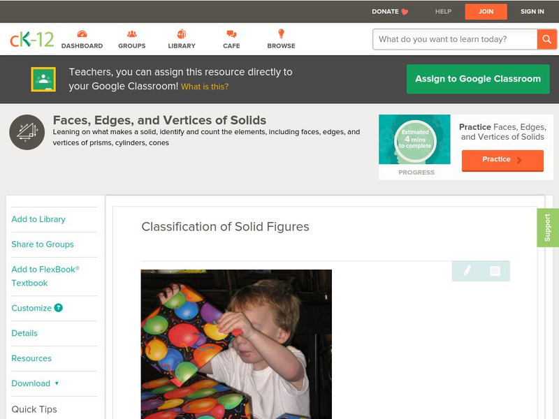 [Free Registration/Login may be required to access all resource tools.] In this lesson students learn to classify solid figures. Students examine guided notes, review guided practice, watch instructional videos and attempt practice...