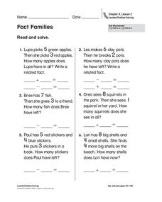 In this fact families practice worksheet, students sharpen their problem solving skills as they solve 6 story problems.