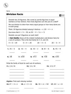 In this division worksheet, 4th graders solve 10 division math problems, write the family of facts for 3 sets of numbers and find the missing number in 4 division algebra problems.