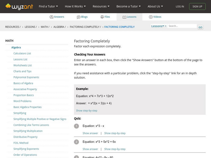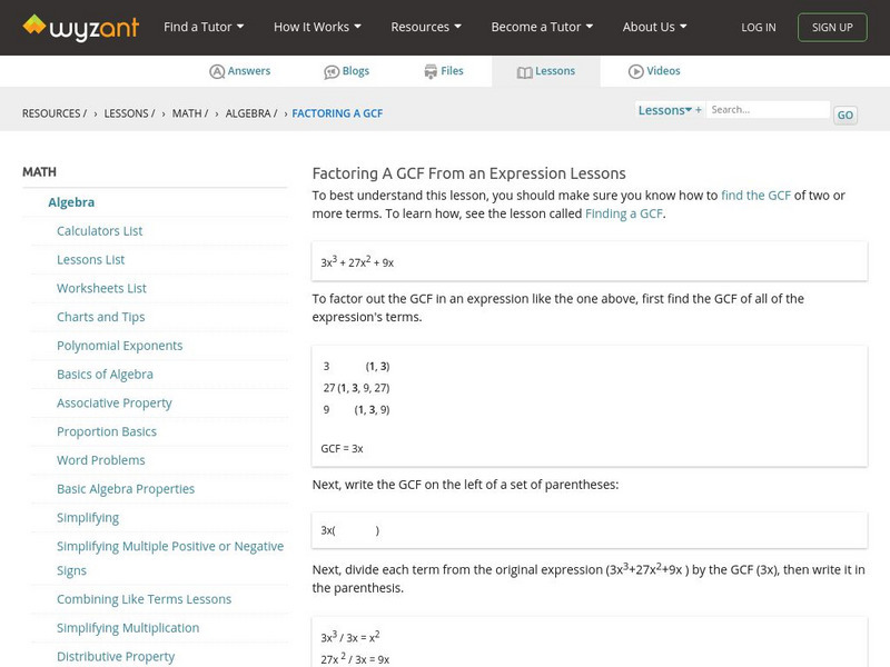 The tutorial explains how to factor a greatest common factor from an expression. The resource includes a lesson with examples, practice problems, and an expression-factoring calculator.