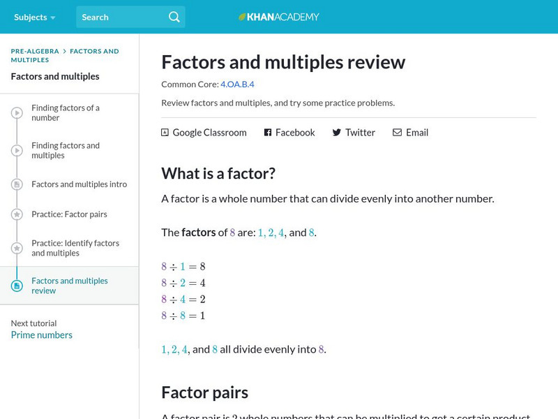 This lesson focuses on factors and multiples; it explains each and provides practice activities and a quiz.