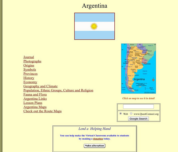 Thorough, informative site about the country of Argentina. Besides factual information, this location also features a journal and photographs of the "World of Wonders" expedition.