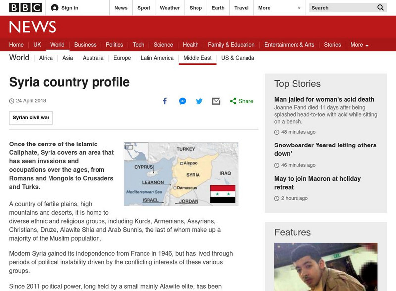 The BBC gives a factual overview of the Middle Eastern country of Syria. Features an audio of the national anthem, a timeline of key events, and links to other related sites.