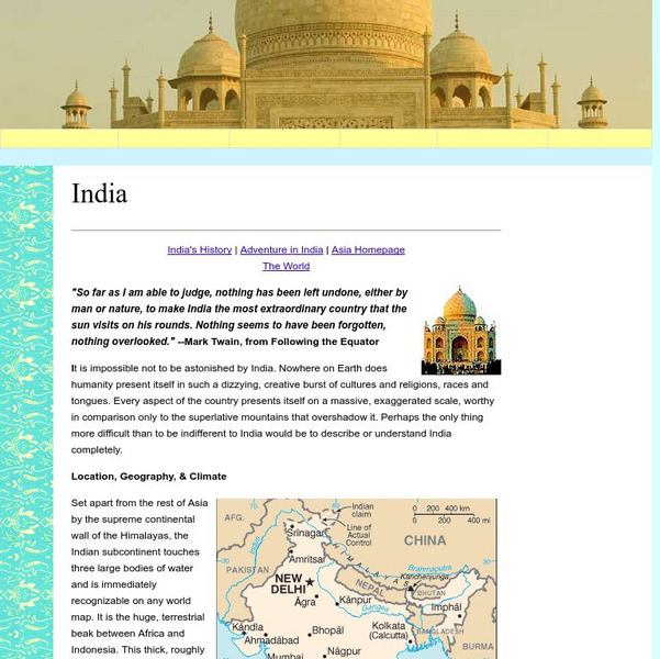 This site from Geographia.com treats the subject of India in a factual presentation of India's location, geography, climate, culture, people, and history. The format is easy to follow, but not necessarily attractively displayed.