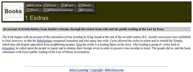 This site from The Bible Tutor provides a very brief but factual background to the apocryphal book of 1 Esdras. Links are provided throughout this paragraph long entry for additional information on related subjects.