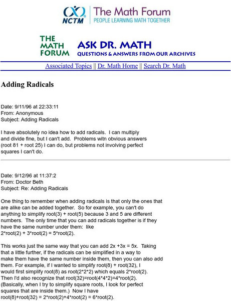 This site from the Math Forum with Dr. Math provides a brief but factual answer to a question posted about adding radicals. Dr. Math answers the question well, and in two paragraphs describes the subject.